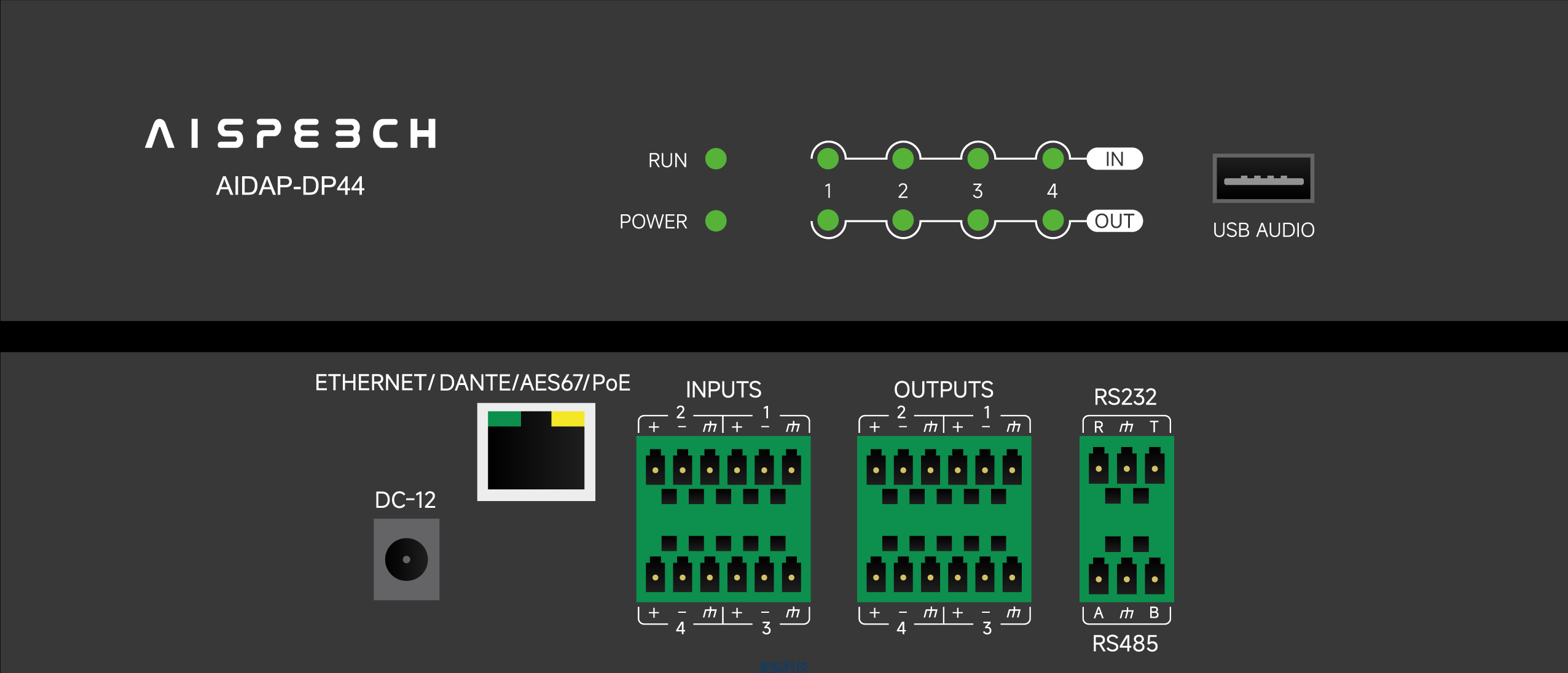 | DP44是思必驰推出的Dante数字音频处理器: 处理器:ADI SHARC 21489@450 MHz SIMD; DSP处理能力::400 MIPS,1.6 GFLOPS; Dante 4x4,模拟 4x4;采样率:48 kHz;内嵌AFC、AEC、ANS模块; 使用不超过的2台吸顶麦场景,兼容第三方音频的方案介入; |